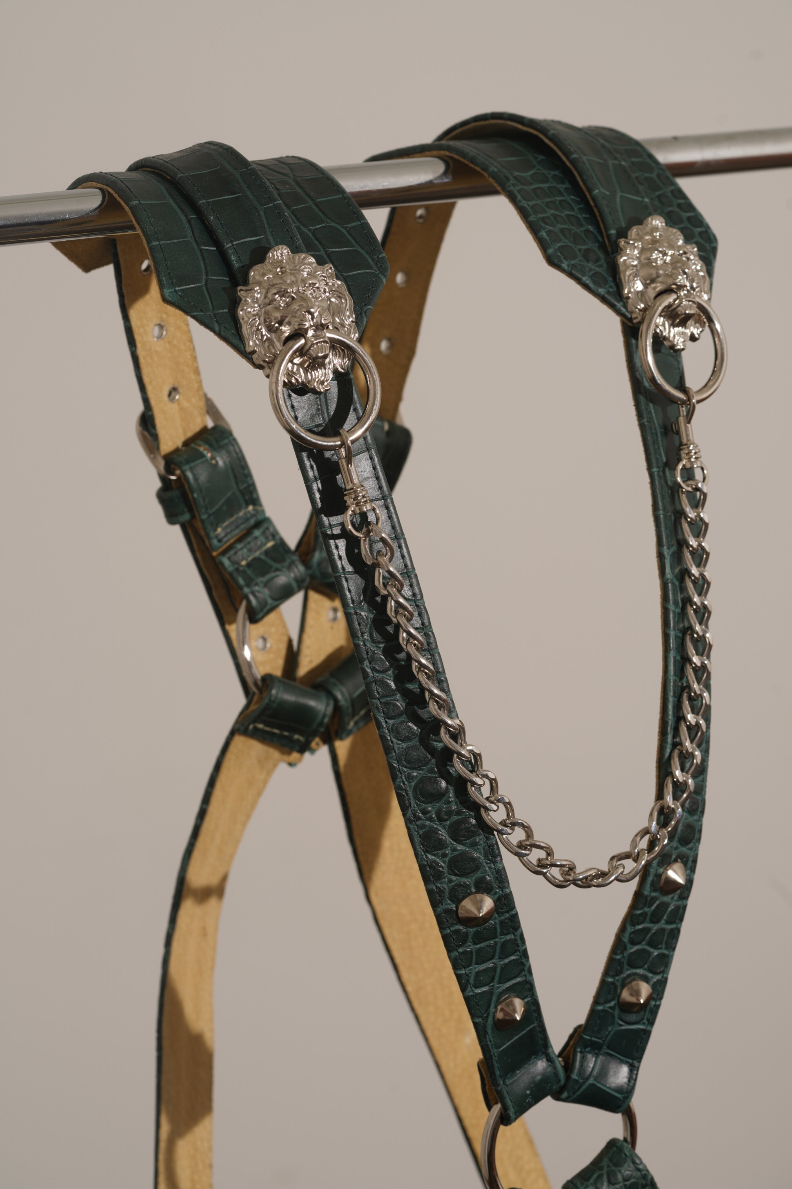 • Features Metal Studs, Lionheads, and Heavy Chain